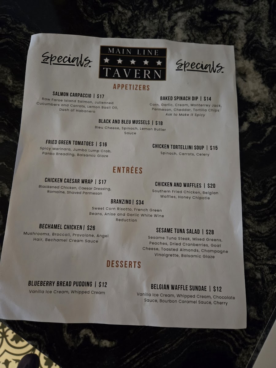 Welcome to Main Line Tavern, your new favorite culinary spot located at 516 E King Rd, Paoli, PA. Here, an impressive menu brims with enticing offerings that cater to every palate. Try the Chicken Caesar Wrap for a satisfying crunch, or indulge in the luxurious Branzino, a delightful seafood favorite at $34. For those seeking something hearty, the Chicken and Waffles entwines sweet and savory beautifully.